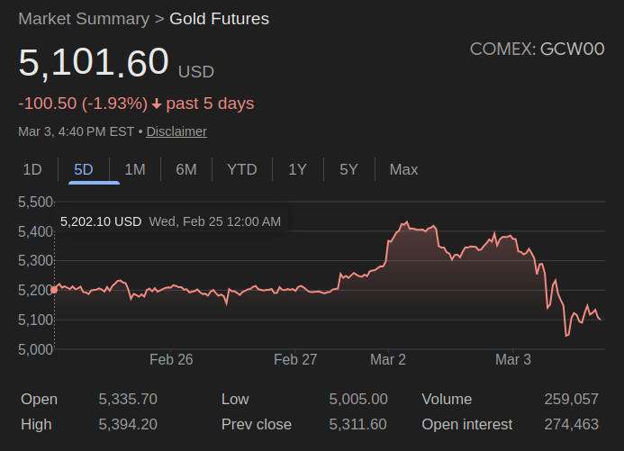 Vào thứ Ba, ngày 3 tháng 3 năm 2026, giá vàng đã sụt giảm khoảng 4%, xuống còn 5.124 Mỹ kim một ounce. Ngược lại, đồng Mỹ kim (USD) lại tăng giá mạnh mẽ, đạt mức cao nhất kể từ tháng Một. Chỉ số Dollar Index, thước đo sức mạnh của đồng bạc xanh so với các ngoại tệ khác, đã tăng lên mức 98.99.
