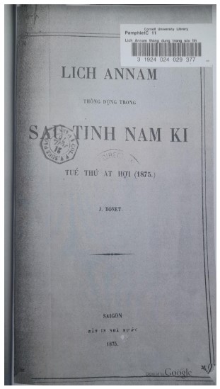 Đầu tiên có lẽ là cuốn Lịch An Nam thuộc về sáu tỉnh Nam Kỳ, Tuế thứ Kỷ Tỵ (năm 1869), chỉ hai năm sau khi Pháp chiếm Vĩnh Long (1867), dưới trang bìa thấy ghi: Saigon, Bản in Nhà nước, 1869.