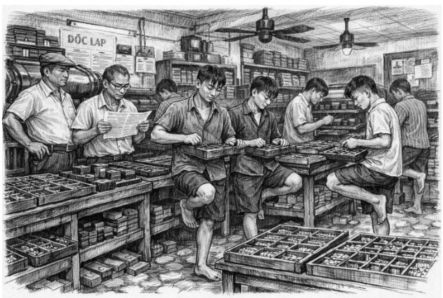 Thợ sắp chữ đôi khi là những em bé cỡ 14, 15 tuổi thường làm việc đứng một chỗ nên luôn luôn đứng một chân, chân kia co lên đạp vào chỗ kheo đầu gối và sau một hồi, khi mỏi thì đổi chân, để có thể đứng sáu bảy giờ liền trước khay chữ. Cho đến giờ này, tôi vẫn chưa hiểu nổi khả năng kỳ diệu của những người thợ. Dân xoa mã chược có thể dùng ngón cái miết quân bài và biết đó là quân gì. Nhưng mã chược chỉ có 160 quân và hơn nữa chỉ có ba hàng văn-vạn-sách nên thủ thuật sờ nắn này không khó lắm, chơi ít lâu là có thể biểu diễn dọa tay mơ. Nhưng số lượng con chữ nhiều hơn hẳn, lại nhỏ li ti, nhất là sau ít lâu bị sứt mẻ. Làm sao những người thợ đó có thể bốc mà trúng ô chữ và sau đó sờ mà nhận ra sự khác nhau của hai mẫu tự ẩ và ầ?